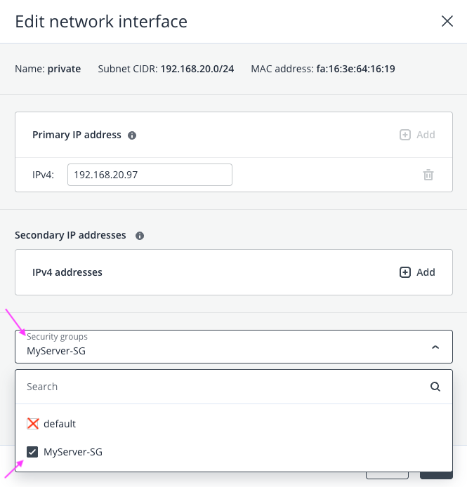 5. Click on Security groups to bring up a drop-down menu of your existing security groups.