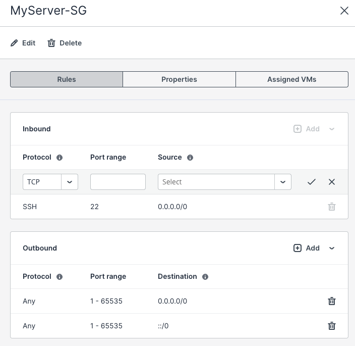 6. Specify a single port (or range) and allowed source IP subnet and click the checkmark button. In the example below, SSH is allowed from anywhere.